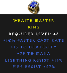 Required Level: 48+10% Faster Cast Rate+13 to DexterityLightning Resist +14%Fire Resist +27%+79 to Mana