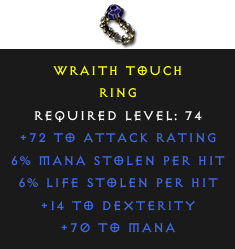 Required Level: 74+14 to Dexterity+72 to Attack Rating6% Life stolen per hit6% Mana stolen per hit+70 to Mana