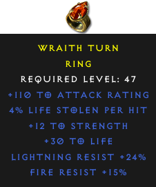Required Level: 47+12 to Strength+110 to Attack Rating+30 to LifeLightning Resist +24%Fire Resist +15%4% Life stolen per hit