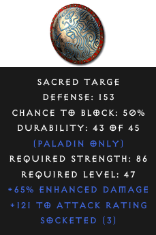 Required Level: 47Defense: 153Socketed (3)+121 to Attack Rating+65% Enhanced Damage
