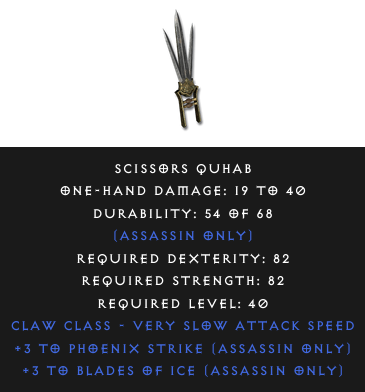 Required Level: 40+3 to Phoenix Strike (Assassin only)+3 to Blades of Ice (Assassin only)