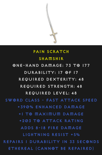 Required Level: 48+1 to Maximum Damage+203 to Attack RatingLightning Resist +5%+390% Enhanced DamageAdds Fire DamageRepairs Durability