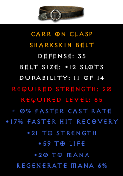Required Level: 85Defense: 35+10% Faster Cast Rate+17% Faster Hit Recovery+21 to Strength+59 to LifeRegenerate Mana 6%+20 to Mana