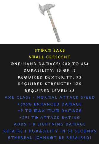 Required Level: 48+9 to Maximum Damage+291 to Attack Rating+395% Enhanced DamageAdds DamageRepairs Durability