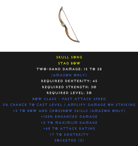 Required Level: 30+2 to Bow and Crossbow Skills (Amazon only)+7 to DexteritySocketed (2)+2 to Maximum Damage+68 to Attack Rating+122% Enhanced Damage