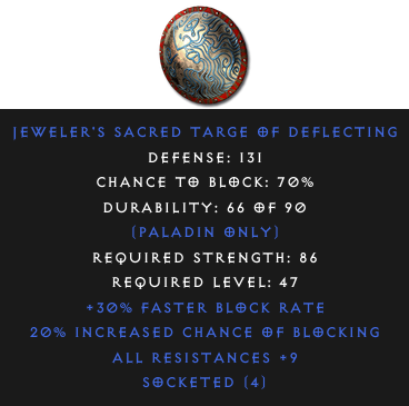 Required Level: 47Defense: 13120% Increased Chance of Blocking+30% Faster Block RateAll Resistances +9Socketed (4)