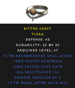 Required Level: 67+2 to Necromancer Skill LevelsDefense: 42+20% Faster Cast Rate+30% Faster Run/WalkAll Resistances +16+2 to Mana after each KillDamage Reduced by 3