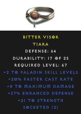Required Level: 67+2 to Paladin Skill LevelsDefense: 64+20% Faster Cast Rate+21 to StrengthSocketed (2)+8 to Maximum Damage+27% Enhanced Defense