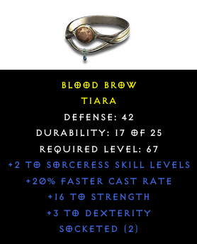 Required Level: 67+2 to Sorceress Skill LevelsDefense: 42+20% Faster Cast Rate+16 to Strength+3 to DexteritySocketed (2)