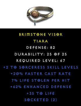 Required Level: 67+2 to Sorceress Skill LevelsDefense: 82+20% Faster Cast RateSocketed (2)+35 to Life+62% Enhanced Defense7% Life stolen per hit