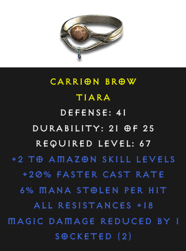 Required Level: 67+2 to Amazon Skill LevelsDefense: 41+20% Faster Cast RateAll Resistances +18Socketed (2)6% Mana stolen per hitMagic Damage Reduced by 1
