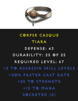 Required Level: 67+2 to Assassin Skill LevelsDefense: 43+20% Faster Cast Rate+25 to StrengthSocketed (2)+15 to Mana