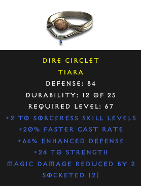 Required Level: 67+2 to Sorceress Skill LevelsDefense: 84+20% Faster Cast Rate+24 to StrengthSocketed (2)+66% Enhanced DefenseMagic Damage Reduced by 2