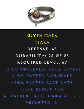 Required Level: 67+2 to Sorceress Skill LevelsDefense: 45+20% Faster Cast Rate+10% Faster Run/WalkSocketed (2)Cold Resist +5%Attacker Takes Damage of 7