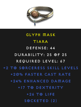 Required Level: 67+2 to Sorceress Skill LevelsDefense: 44+20% Faster Cast Rate+17 to DexteritySocketed (2)+26 to Life+24% Enhanced Damage