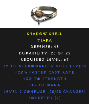 Required Level: 67+2 to Necromancer Skill LevelsDefense: 48+20% Faster Cast Rate+30 to StrengthSocketed (2)+13 to Mana