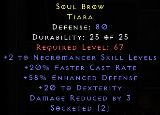 Defense: 80Required Level: 67+2 to Necromancer Skill Levels+20% Faster Cast Rate+20 to DexteritySocketed (2)+58% Enhanced DefenseDamage Reduced By 3