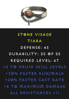 Required Level: 67+2 to Druid Skill LevelsDefense: 45+20% Faster Cast Rate+30% Faster Run/WalkAll Resistances +11+8 to Maximum Damage