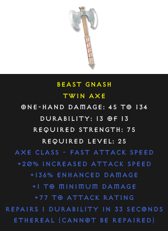 Required Level: 25+20% Increased Attack Speed+77 to Attack Rating+136% Enhanced DamageRepairs Durability+1 to Minimum Damage