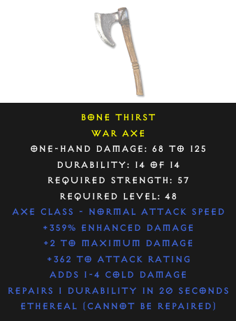 Required Level: 48+2 to Maximum Damage+362 to Attack Rating+359% Enhanced DamageAdds Cold DamageRepairs Durability