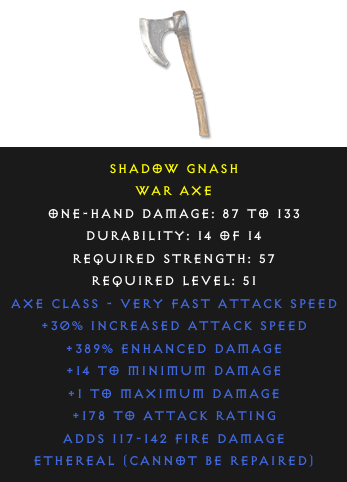 Required Level: 51+30% Increased Attack Speed+1 to Maximum Damage+178 to Attack Rating+389% Enhanced DamageAdds Fire Damage+14 to Minimum Damage