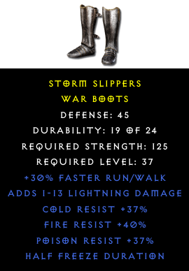Required Level: 37Defense: 45+30% Faster Run/WalkPoison Resist +37%Cold Resist +37%Fire Resist +40%Adds DamageHalf Freeze Duration