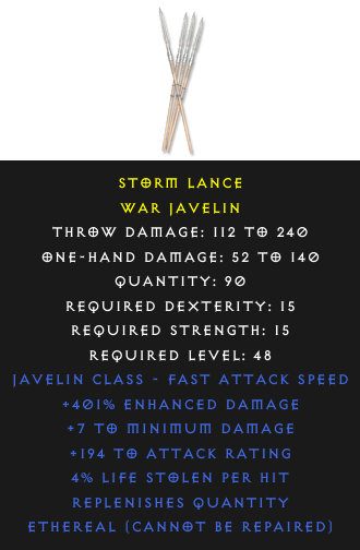 Required Level: 48+194 to Attack Rating+401% Enhanced DamageReplenishes quantity4% Life stolen per hit+7 to Minimum Damage
