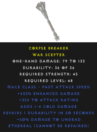 Required Level: 48+355 to Attack Rating+432% Enhanced DamageAdds Cold DamageRepairs Durability+50% Damage to Undead