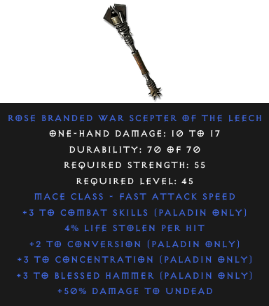 War Scepter: Rose Branded War Scepter Of The LeechRequired Level: 45 Rarity: magic | Select the realm to see the price |