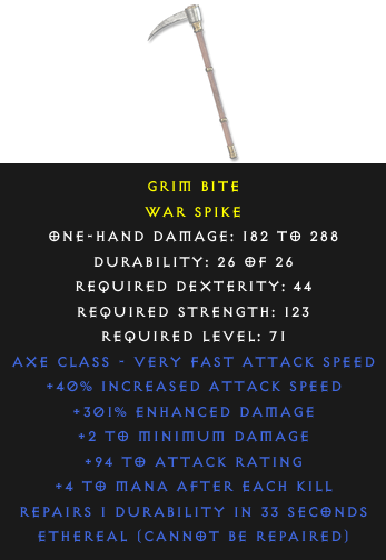 Required Level: 71+40% Increased Attack Speed+94 to Attack Rating+301% Enhanced DamageRepairs Durability+4 to Mana after each Kill+2 to Minimum Damage
