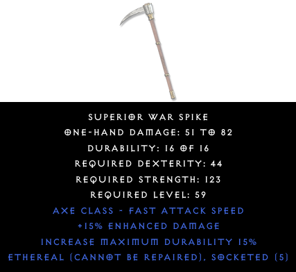 Required Level: 59Socketed (5)+15% Enhanced DamageIncrease Maximum Durability 15%
