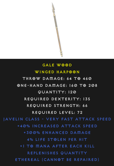 Required Level: 72+40% Increased Attack Speed+300% Enhanced DamageReplenishes quantity+1 to Mana after each Kill4% Life stolen per hit