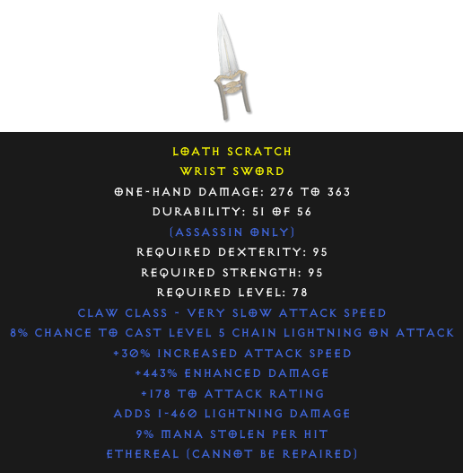 Required Level: 78+30% Increased Attack Speed+178 to Attack Rating+443% Enhanced DamageAdds Damage9% Mana stolen per hit
