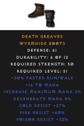 Required Level: 51Defense: 61+30% Faster Run/WalkPoison Resist +32%Cold Resist +27%Fire Resist +40%Regenerate Mana 8%Increase Maximum Mana 2%+16 to Mana
