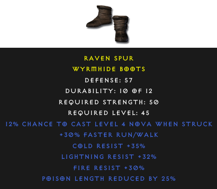 Required Level: 45Defense: 57+30% Faster Run/WalkCold Resist +35%Lightning Resist +32%Fire Resist +30%Poison Length Reduced by 25%