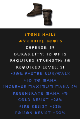 Required Level: 51Defense: 59+30% Faster Run/WalkPoison Resist +30%Cold Resist +28%Fire Resist +33%Regenerate Mana 4%Increase Maximum Mana 2%+10 to Mana
